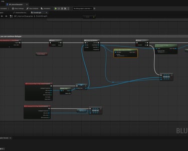 A custom dialogue system with the possibility for branching dialogue, cinematic camera angles, rewards for selecting certain dialogue options, easy implementation of more systems and customizability in the dialogue, and more